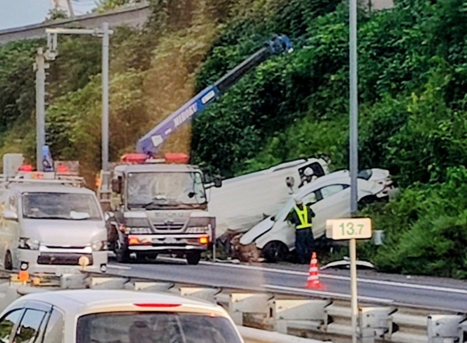 事故発生直後から、現場を通りかかったドライバーによってSNS上に多数の目撃情報が投稿されています。それらの情報によると、「乗用車2台が土手に屋根を合わせて突っ込んでる」「2台とも大破している」といった、事故の激しさを物語る内容が多く見られます。投稿された画像からは、2台の車両が通常では考えられない形で法面に乗り上げ、横転しているかのような異常な状態で停止している様子が確認できます。「何が起きたんだこれ」というコメントも投稿されており、事故現場の異様な光景と混乱ぶりがうかがえます。けが人の有無や安否に関する情報はまだ入っていませんが、車両の損傷具合から、乗っていた方の状態が非常に心配されます。現場にはすでに警察車両やレッカー車が到着し、事後処理にあたっています。