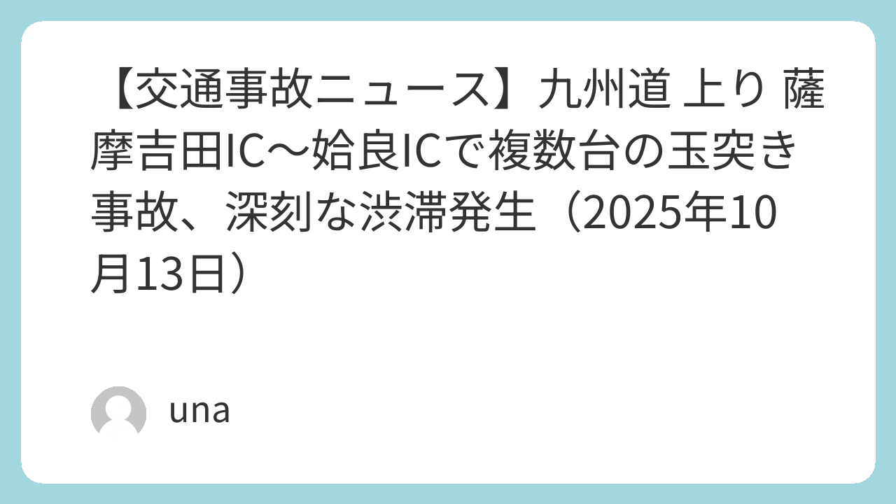 【交通事故ニュース】九州道 上り 薩摩吉田IC~姶良ICで複数台の玉突き事故、深刻な渋滞発生(2025年10月13日)
